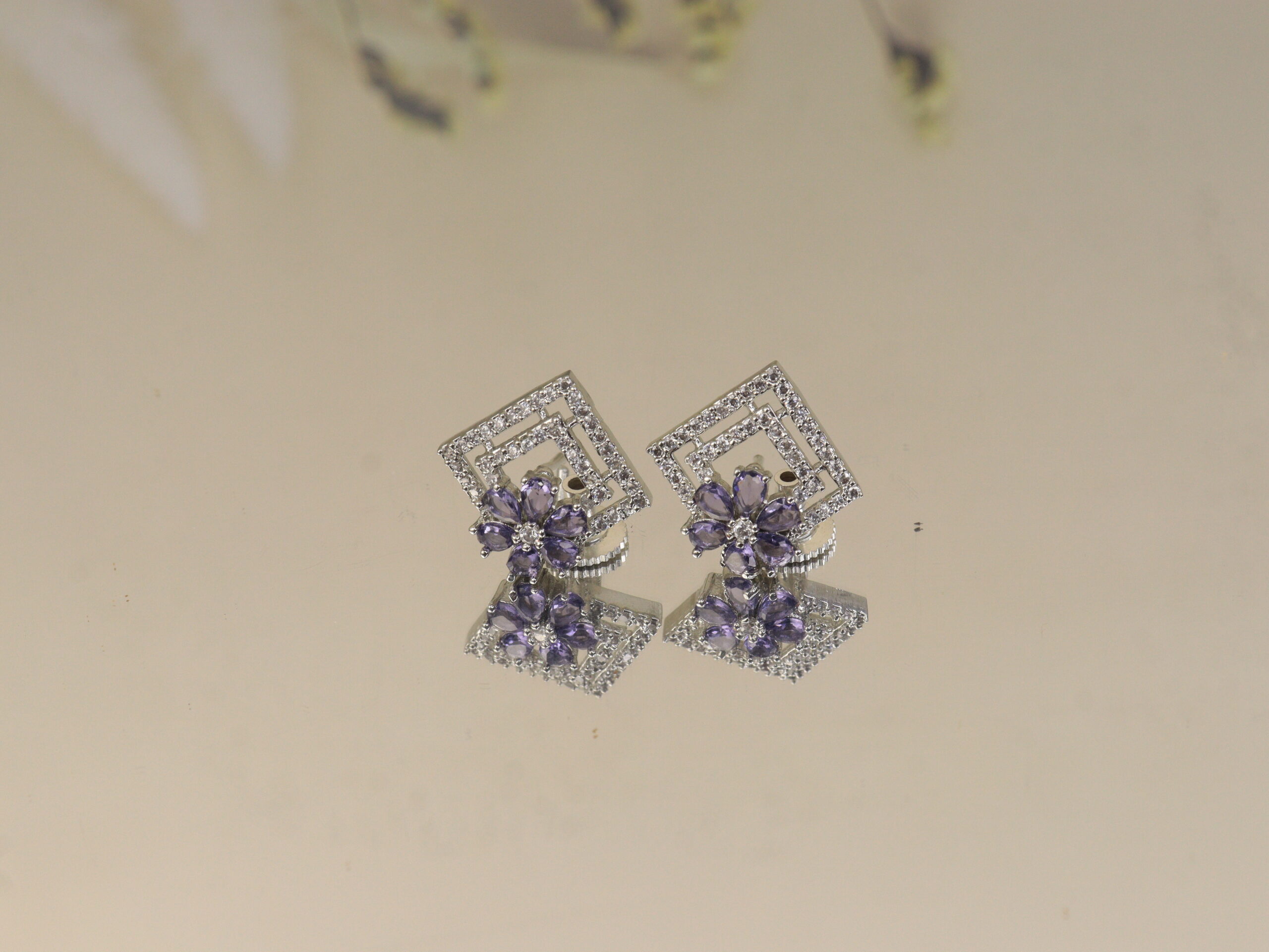 Elevate your everyday and festive ensembles with these beautifully designed Silver Tops, where geometric elegance meets delicate floral detailing. These earrings feature a modern diamond-shaped double frame encrusted with shimmering white CZ stones, perfectly complemented by a cluster of deep violet floral stones at the base. The blend of precision craftsmanship and luxe design makes this pair a stunning statement piece that effortlessly fuses Indian charm with contemporary finesse.