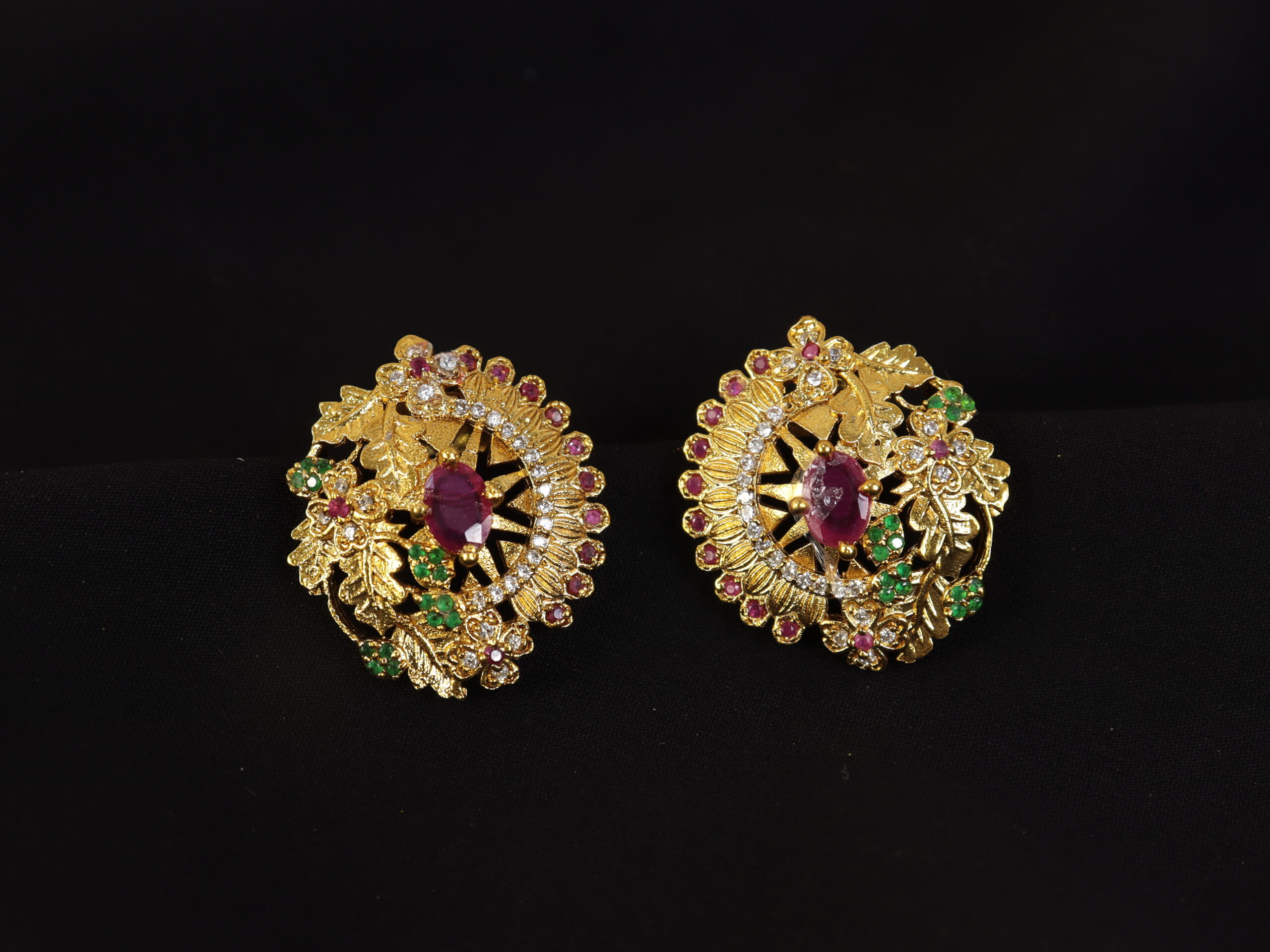 bring to you a stunning pair of Matt Mini Tops that celebrate age-old craftsmanship with a burst of festive colour. These elegantly crafted tops showcase a luxurious gold-tone floral pattern, beautifully highlighted with ruby-red, emerald-green, and shimmering white stones. The detailed leaf accents and graceful circular structure reflect the timeless charm of traditional Indian design