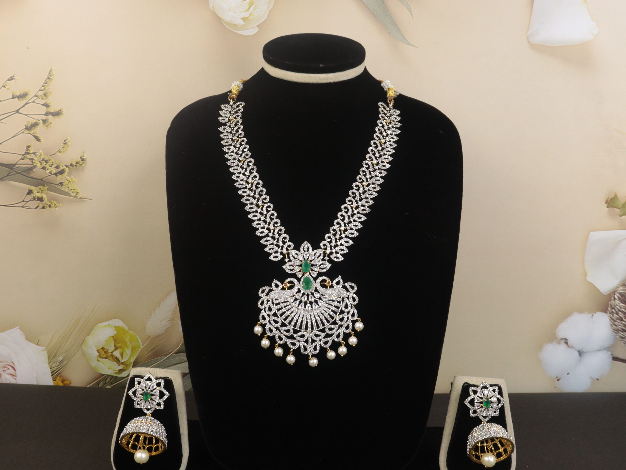 Complemented by intricately designed floral jhumka earrings, this set exudes grandeur perfect for bridal wear, festive ensembles, or cultural celebrations. The green stones symbolize prosperity and renewal, making it not just a piece of jewelry, but a meaningful accessory rooted in Indian tradition.