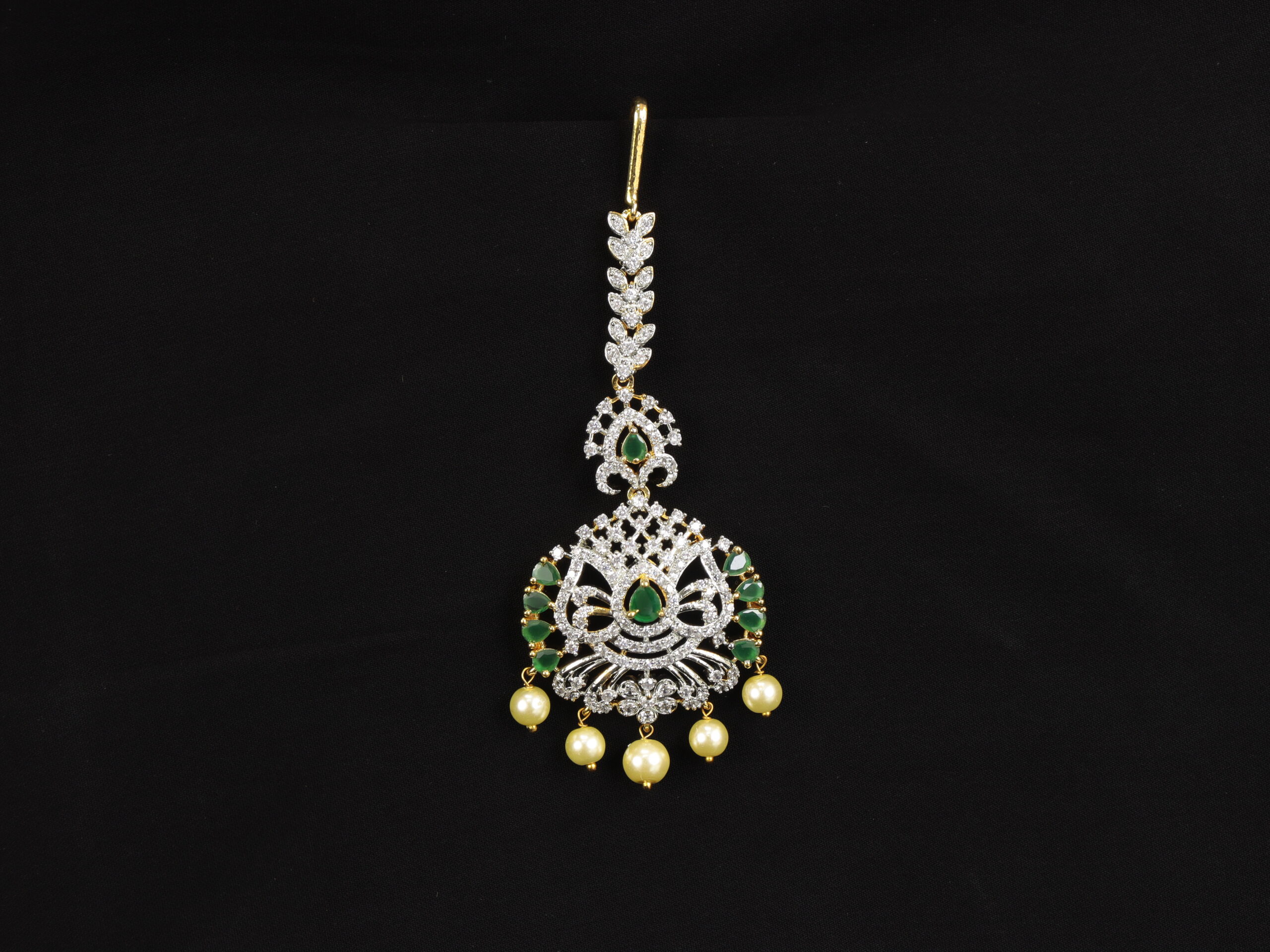 This GJ Tika features a delicate vine-like stem adorned with shimmering white stones leading down to a grand pendant encrusted with vibrant green teardrop stones, dazzling white crystals, and lustrous pearl droplets. The graceful design pays homage to traditional Indian bridal jewelry, yet is versatile enough to complement contemporary ethnic fashion.