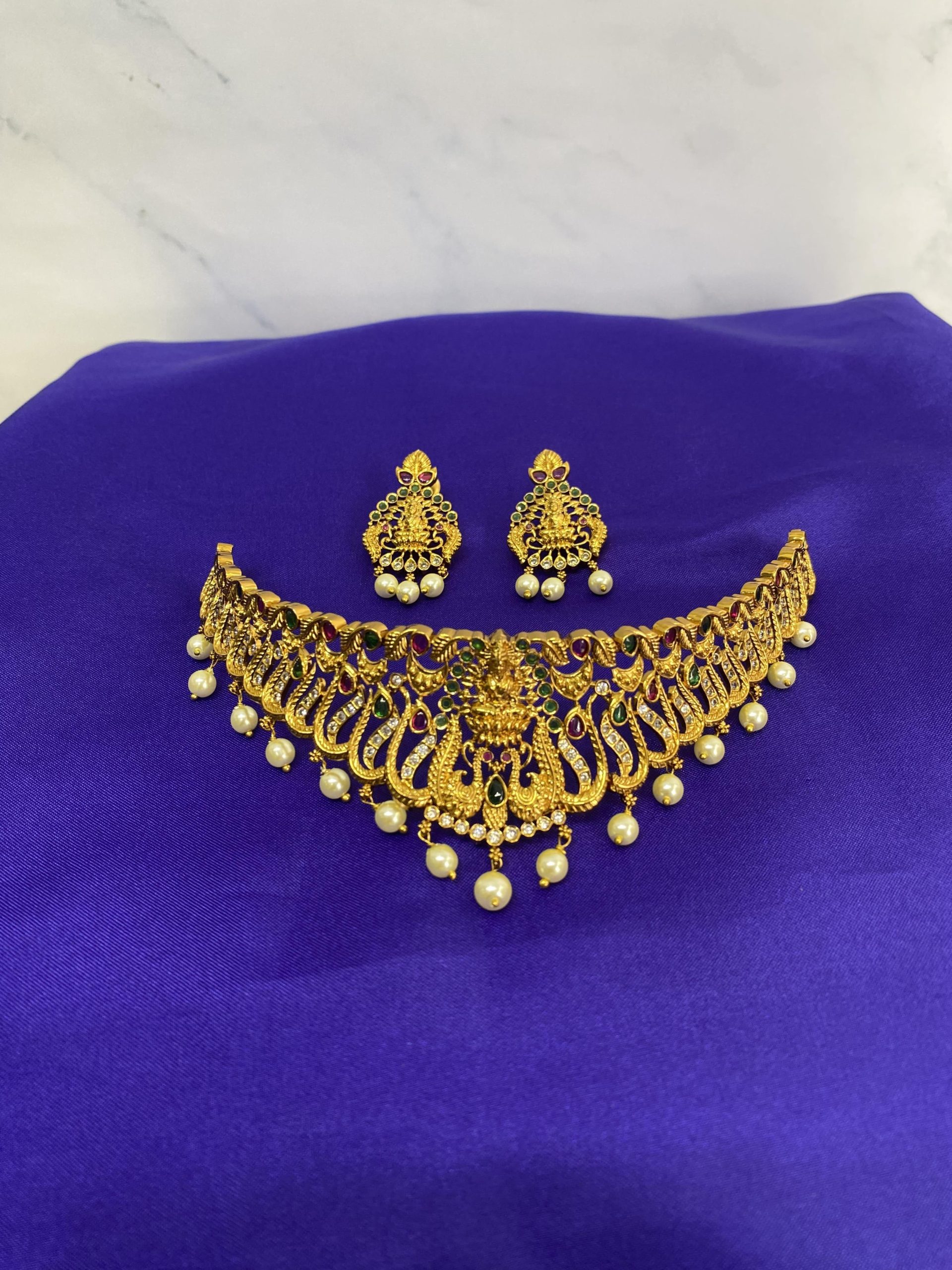 Ideal for weddings, festivals like Navratri or Pongal, Bharatanatyam dance performances, or traditional family gatherings, this matt-finish choker necklace and matching earrings bring a touch of cultural heritage to every look. Whether you are a bride, bridesmaid, or simply a lover of temple jewelry, this piece is designed to make you feel empowered and adorned.