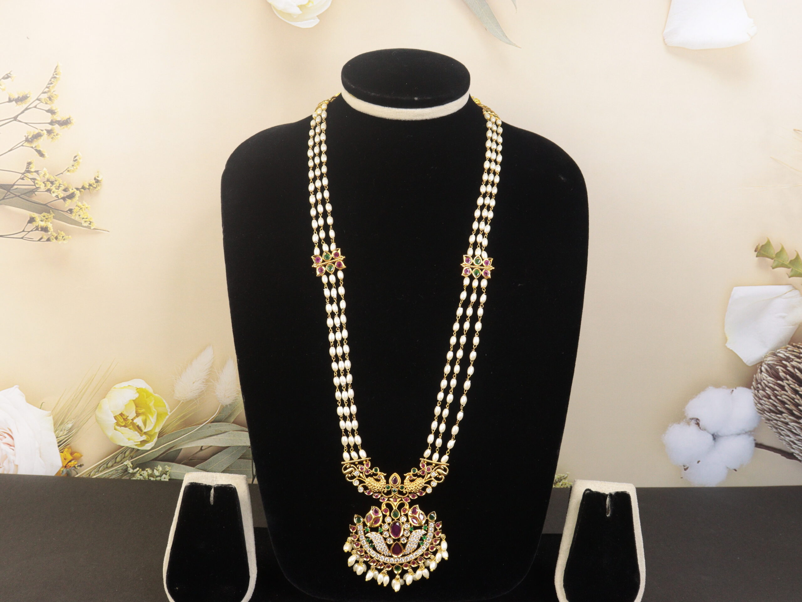 The centerpiece locket draws inspiration from temple-style motifs, intricately adorned with ruby red, emerald green, and shimmering white stones that form a graceful crescent-shaped design. The gentle shimmer of pearls combined with the ornate locket creates a harmonious balance between divinity and sophistication, making it an ideal choice for festivals, weddings, religious ceremonies, and cultural gatherings.