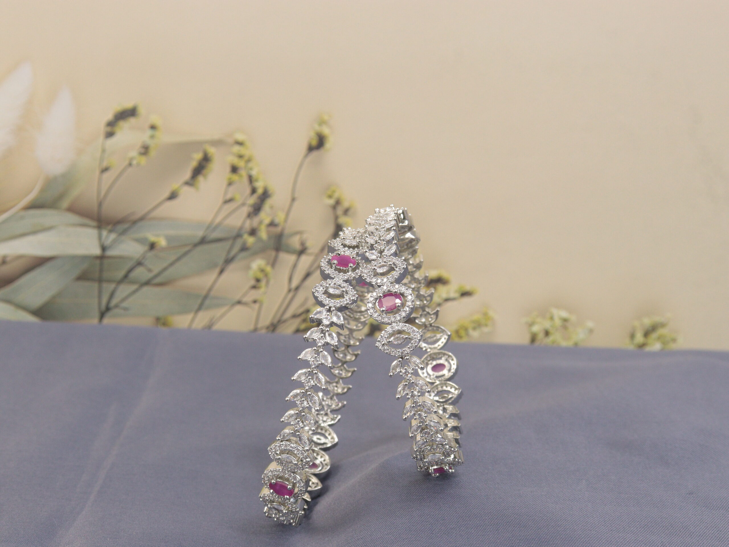 Add a touch of regality to your ensemble with these gracefully handcrafted silver bangles for women, embellished with vibrant pink cubic zirconia stones and leaf-like crystal motifs. A perfect fusion of contemporary shine and traditional elegance, these rhodium-plated bangles are an ode to Indian artistry and feminine beauty.