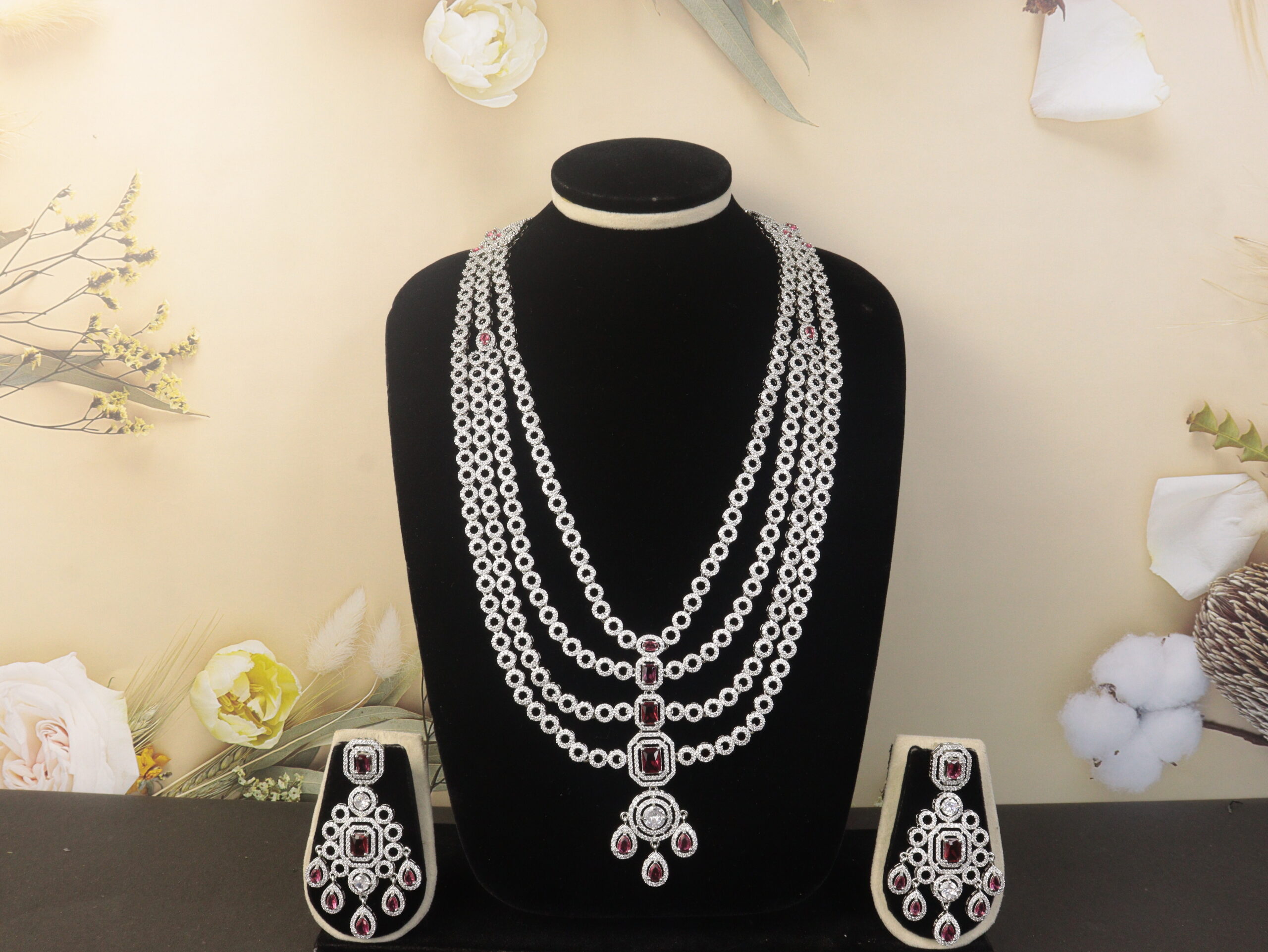 bring you this spectacular multi-layered silver necklace set, delicately adorned with ruby red and dazzling white stones. Designed for the modern queen with a love for timeless traditions, this necklace is a graceful blend of heritage elegance and sophisticated craftsmanship.