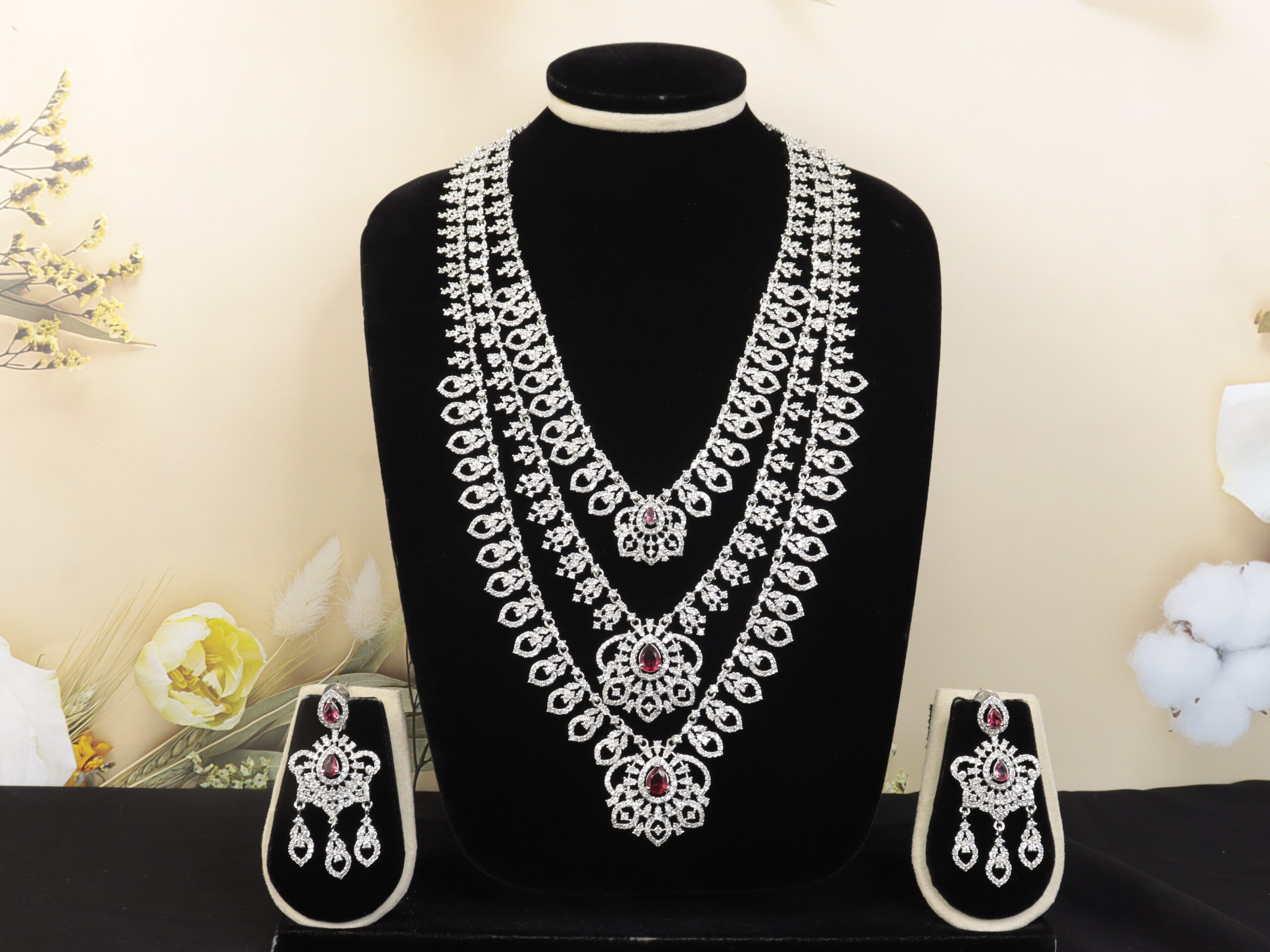 proudly introduce this exquisite red stone silver long necklace set – a celebration of traditional artistry and royal elegance.This layered silver necklace, embedded with sparkling American diamonds and deep ruby-toned stones, captures the spirit of cultural grandeur. The intricate craftsmanship, featuring peacock-feather-inspired motifs and graceful teardrop elements, pays homage to India’s heritage of bridal and festive jewelry. Its complementing earrings add finesse, making this set a timeless choice for special occasions.