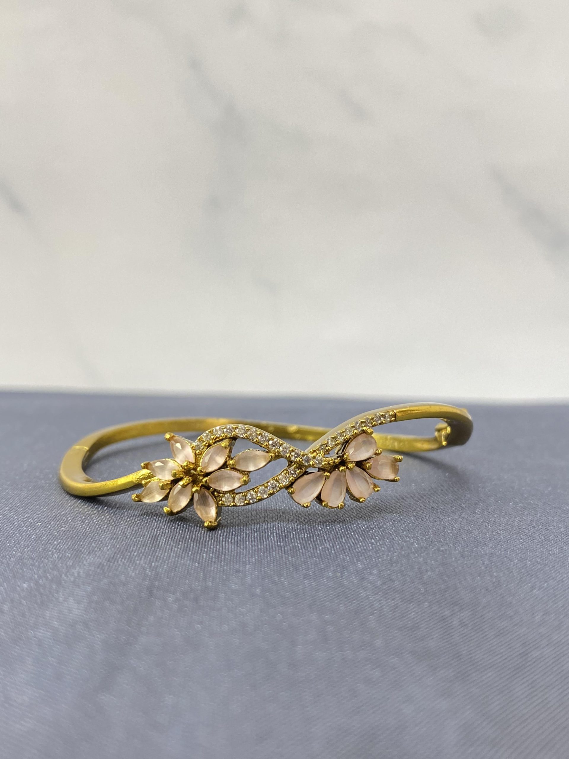 This exquisite bracelet features a gently curving infinity motif studded with shimmering CZ stones, complemented by two delicate pastel-pink floral clusters that evoke soft romance and vintage opulence. The gold-plated finish enhances its regal appeal while offering a versatile accessory that suits both modern and traditional outfits. Whether you’re dressing up for a wedding, a festive gathering, or a formal evening, this Victorian bracelet effortlessly adds sophistication and sparkle to your style.