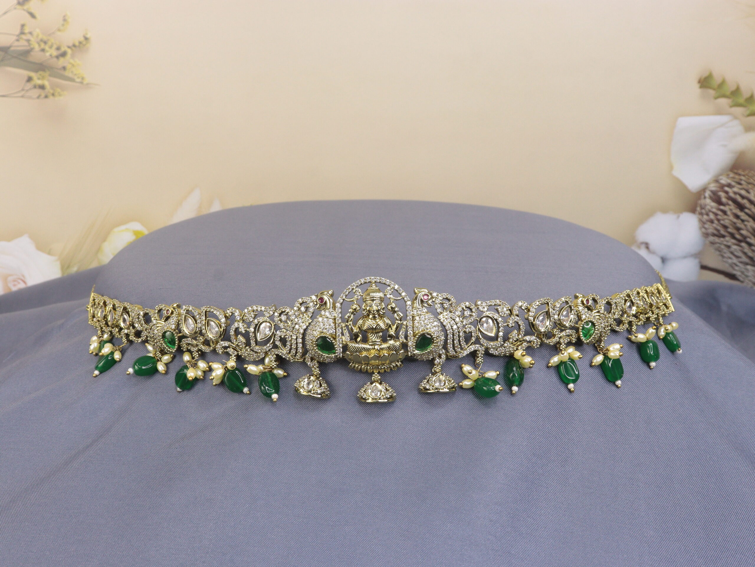 Home All Products Vaddanam Victorian Chain Belt Lakshmi Motif and Green Drops.