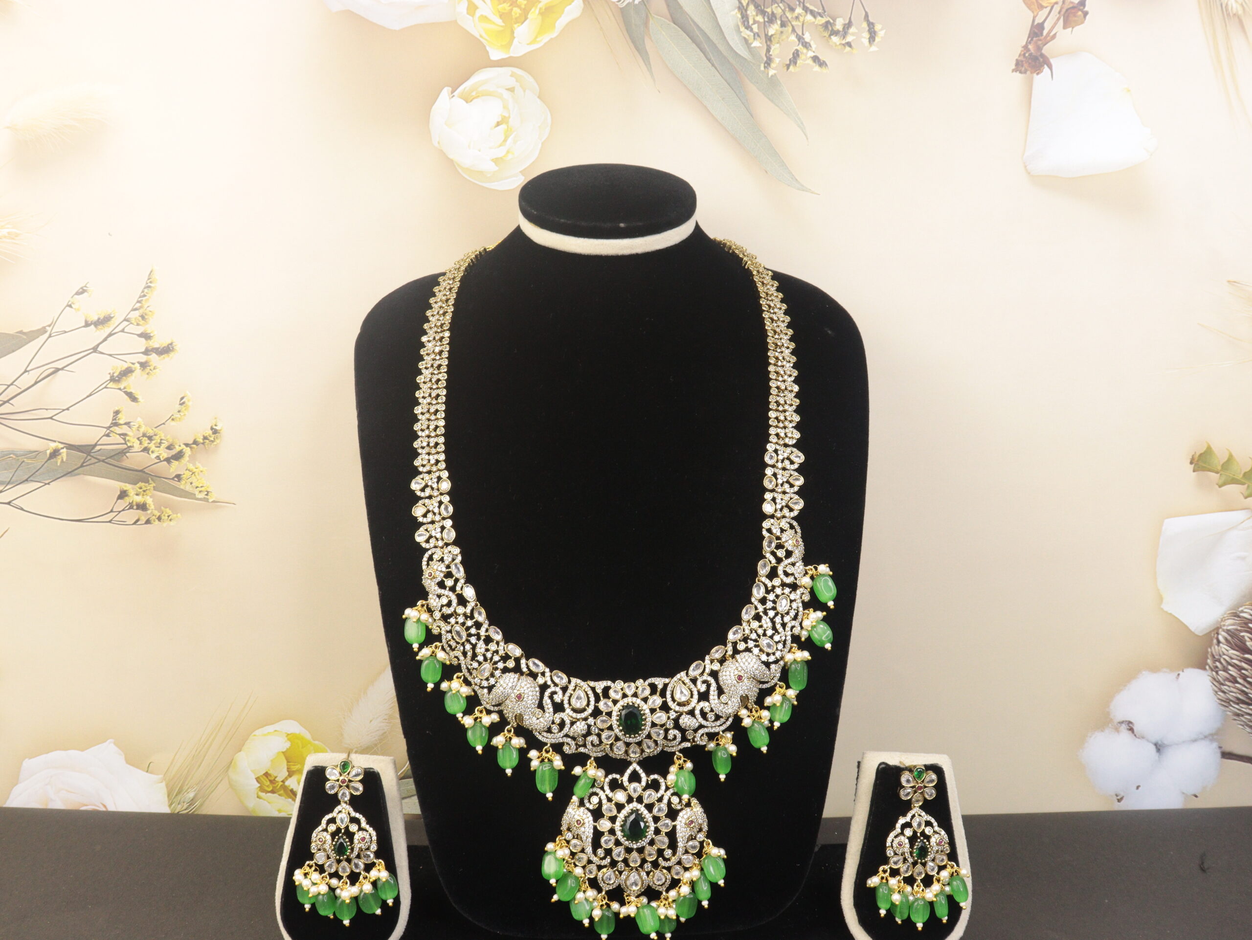 Evoke a regal aura with this Victorian-inspired long necklace set, designed to blend vintage sophistication with timeless Indian grandeur. The lavish combination of green and gold, highlighted by precision-cut stones, lends this piece a luxurious and festive finish.