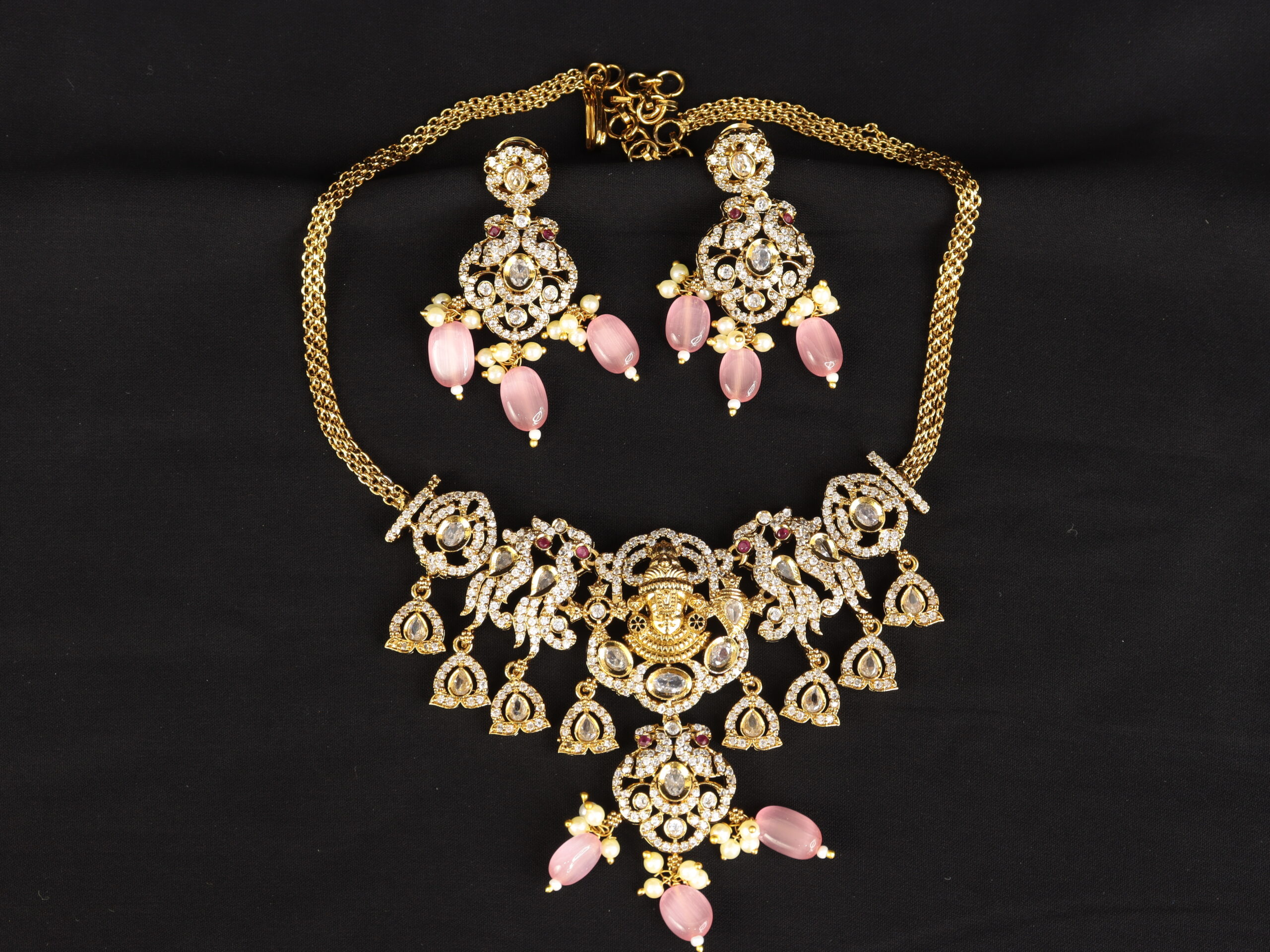 The intricate detailing, adorned with high-shine CZ stones, delicate floral motifs, and soft pink drops, pays tribute to the classic Victorian style infused with South Indian spiritual heritage. This choker set is completed with a matching pair of earrings, making it a versatile and radiant choice for bridal wear, traditional functions, or festive celebrations.