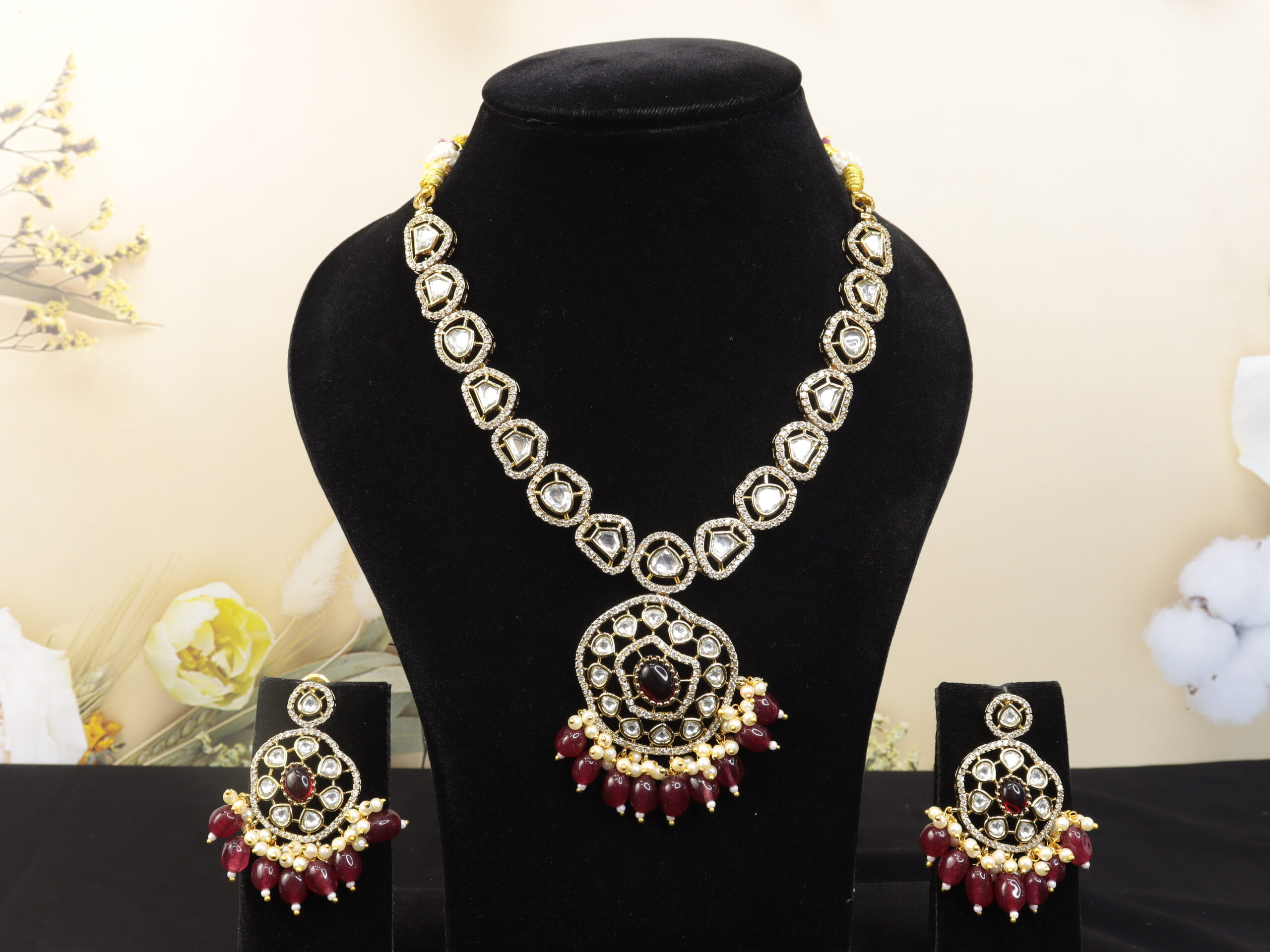 Designed with intricately set kundan-style stones and highlighted with rich red beads, this set is a perfect harmony of opulence and sophistication. The central pendant, with its circular geometry and ornate detailing, creates a graceful focal point, while the matching earrings add a touch of coordinated charm. Ideal for brides, bridesmaids, or anyone wishing to elevate their ethnic or festive look.