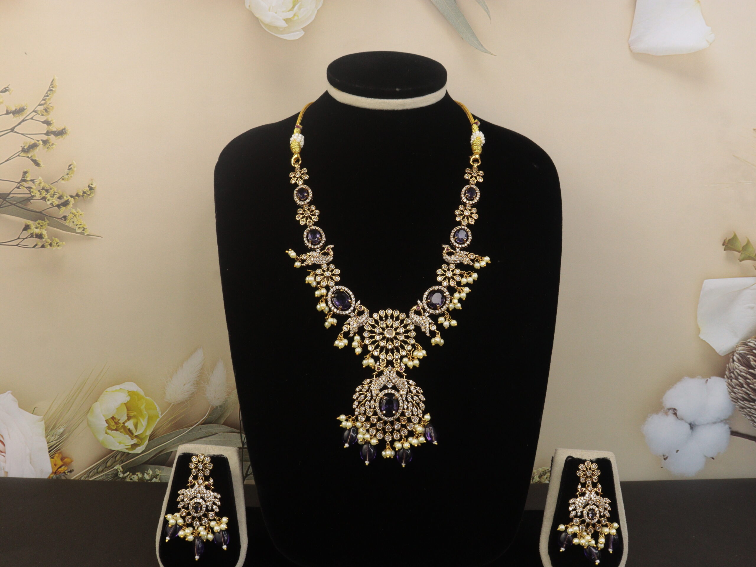 Crafted for those who cherish luxury and legacy, this Victorian short necklace set showcases circular floral motifs with hand-set purple stones surrounded by delicate gold plating. The centerpiece medallion radiates out like a blooming flower, symbolizing grace, power, and beauty. Complete with matching earrings, it’s ideal for special occasions where you want to shine with heritage charm.