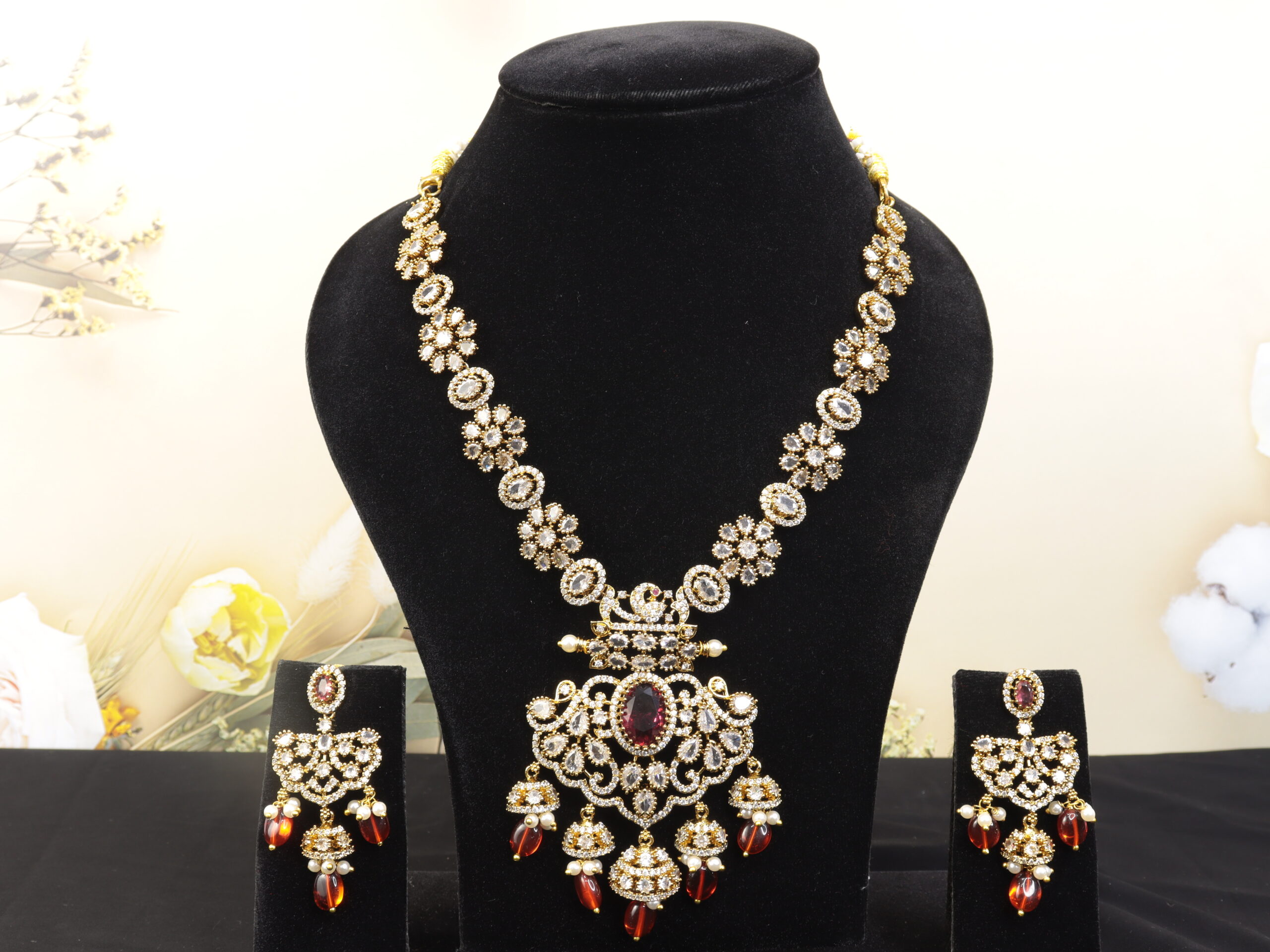Rooted in the elegance of the Victorian era and enhanced by Indian design sensibilities, this necklace features regal floral motifs in a layered composition of finely studded white stones. The centerpiece is highlighted by a rich ruby-red gem that cascades into radiant red bead drops, adding a bold yet graceful touch.